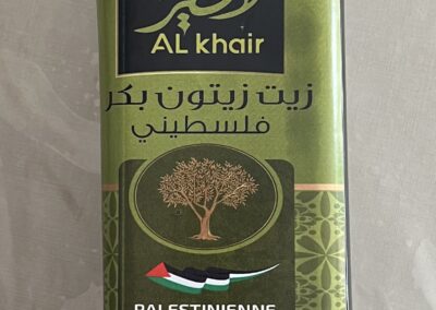 Huile d’Olive vierge de Palestine, de première pression, extraite à froid, certifiée biologique et équitable (Palestinian agriculture – Ecocert).